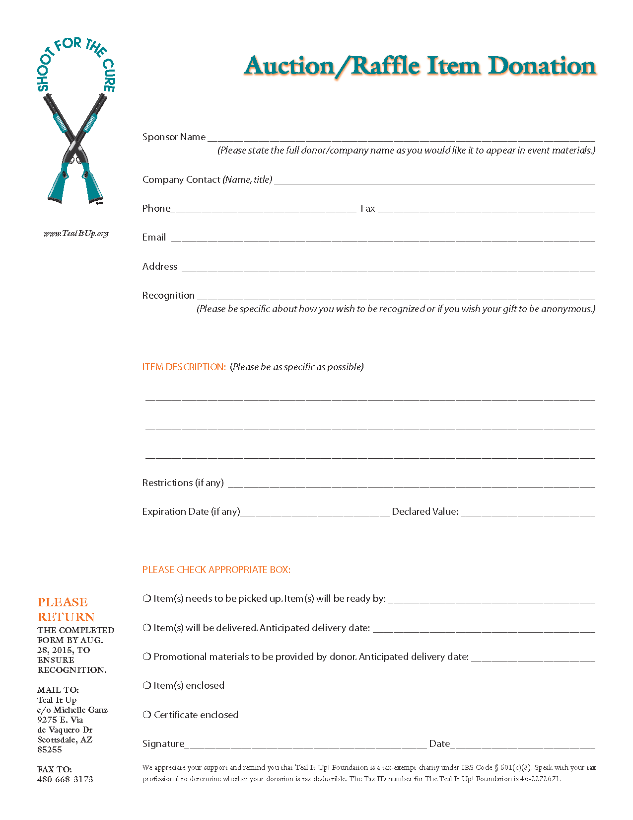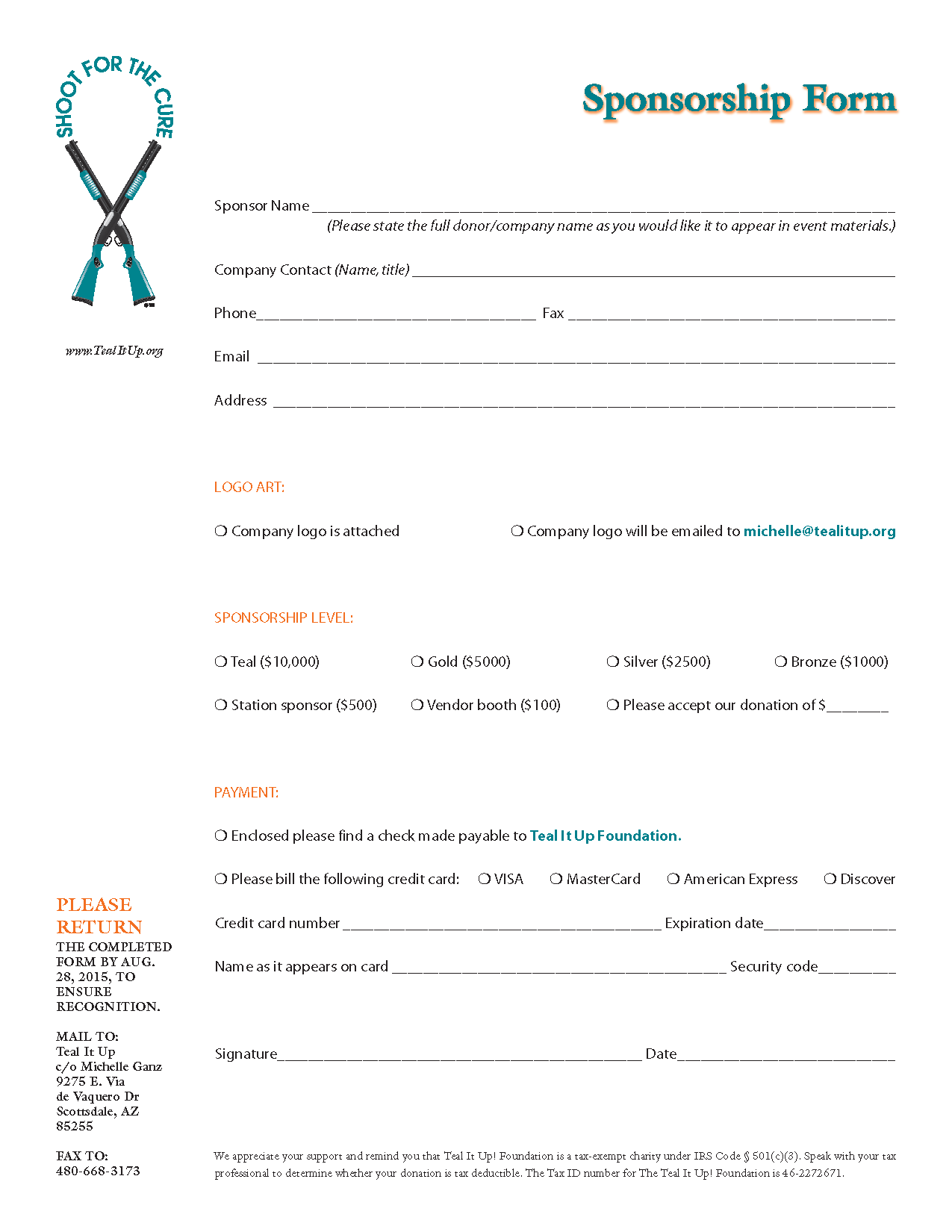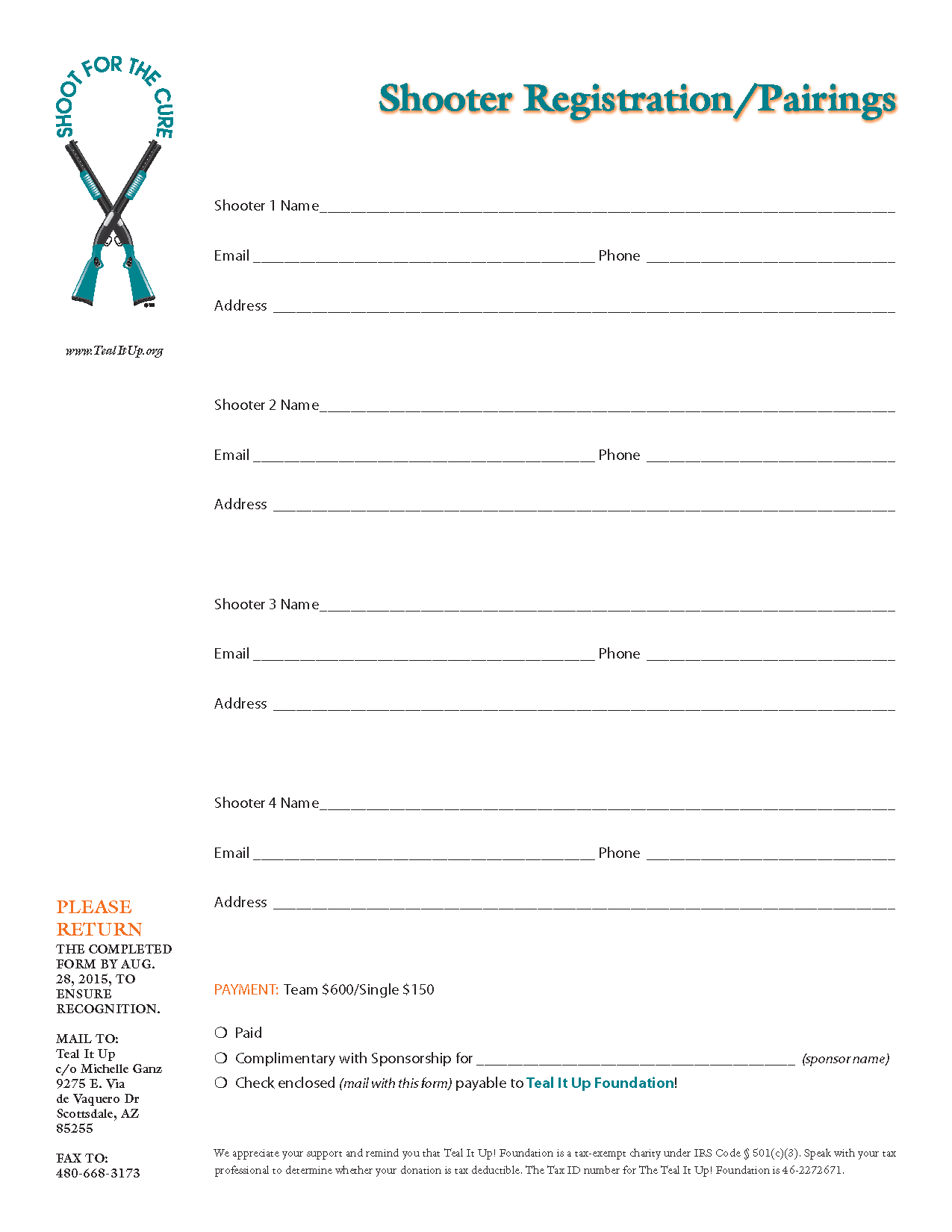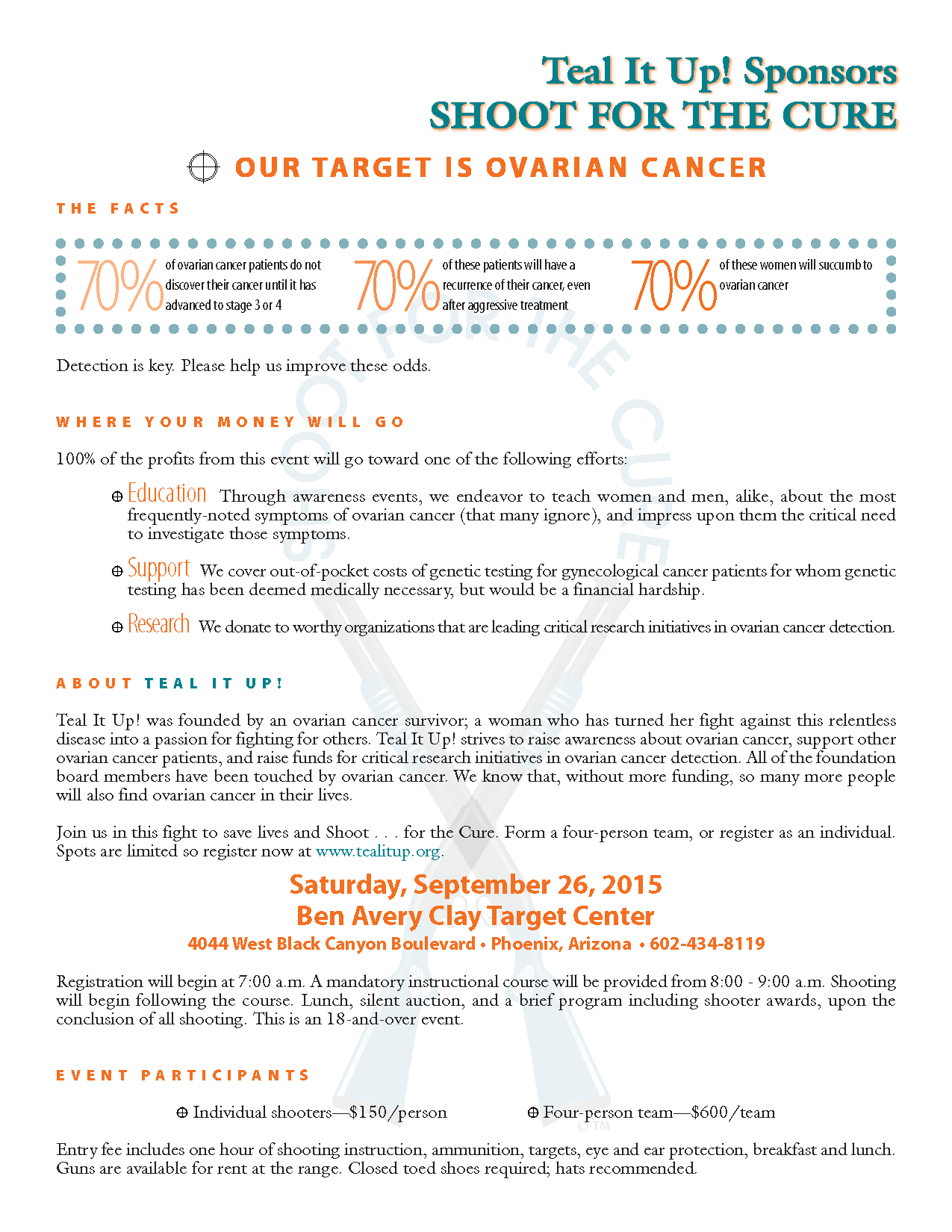 Shoot for the Cure is a skeet-shooting event scheduled for September 26, 2015. Further information may be found at the TealItUp.org website. For the new event, Graphic Ideals provided a logo, letterhead, and all of the registration and sponsorship sheets. And of course we were sensitive to their limited budget—the money should go to victims, not vendors!